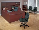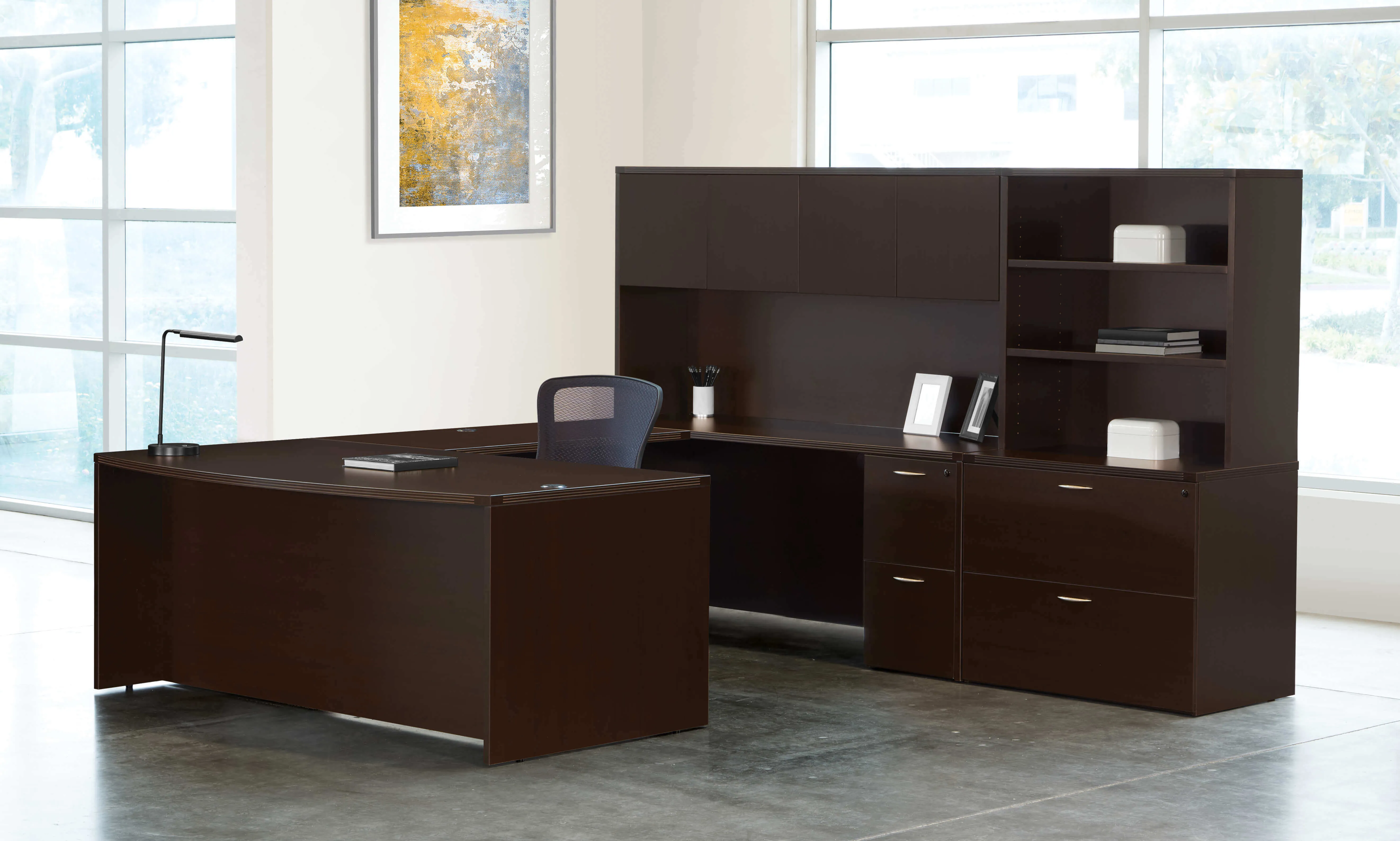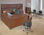 This u shaped desk is available in 6 color options, in Espresso tone with metallic hardware pulls; and also in Cherry, Mahogany, Slate Grey, Urban Walnut and White with black hardware pulls.