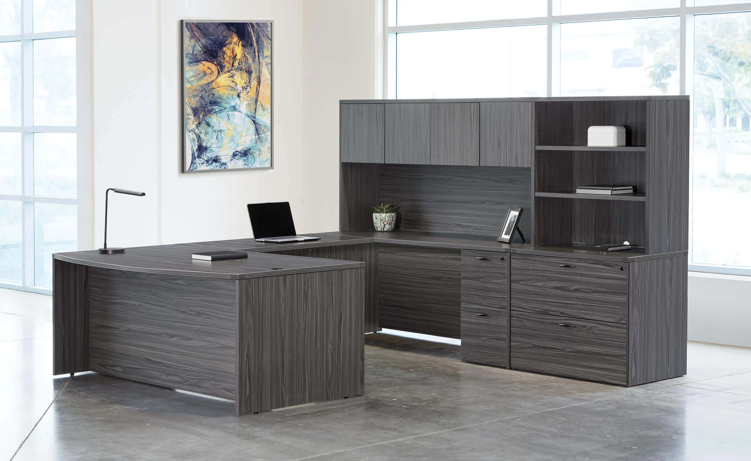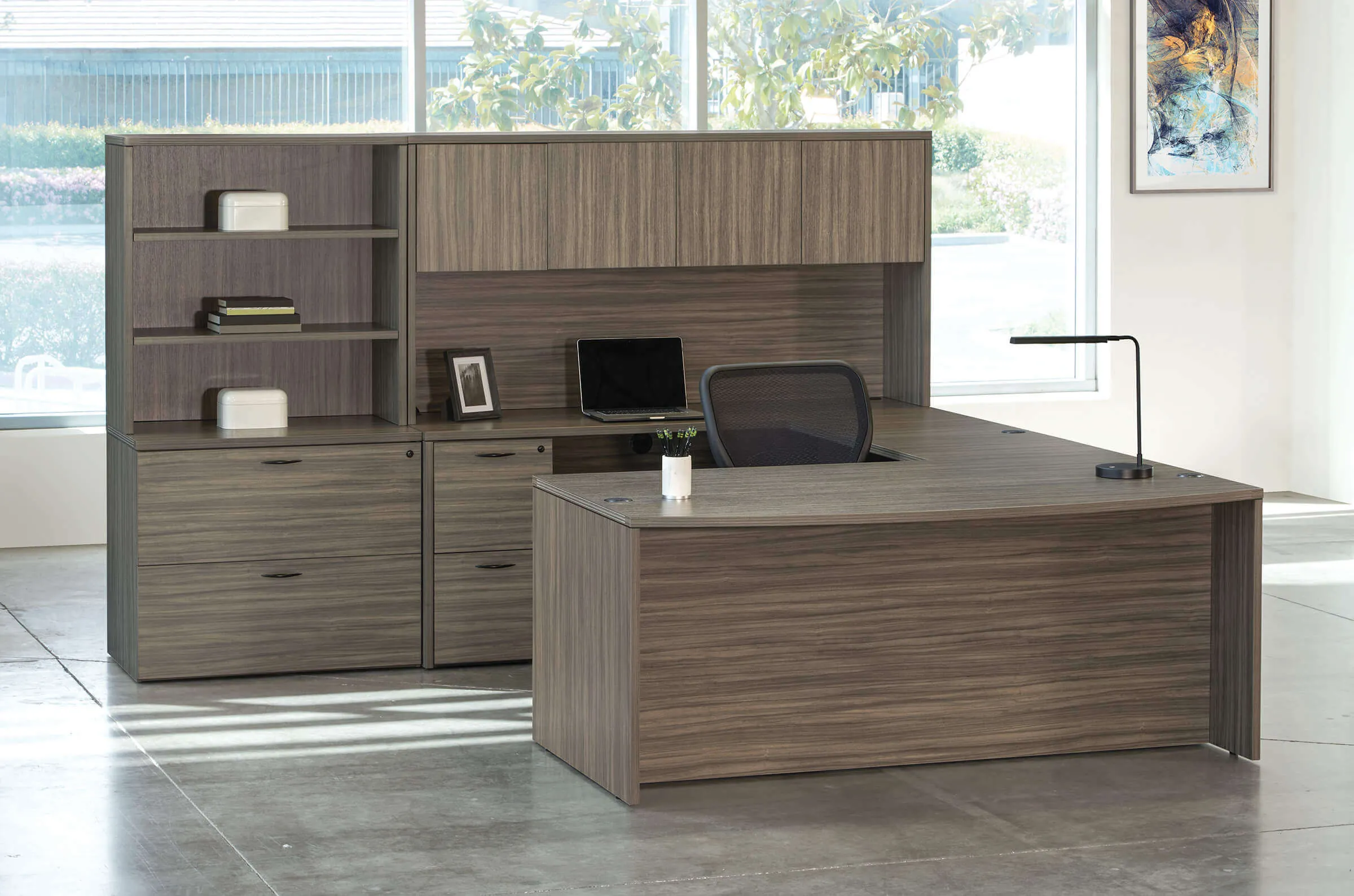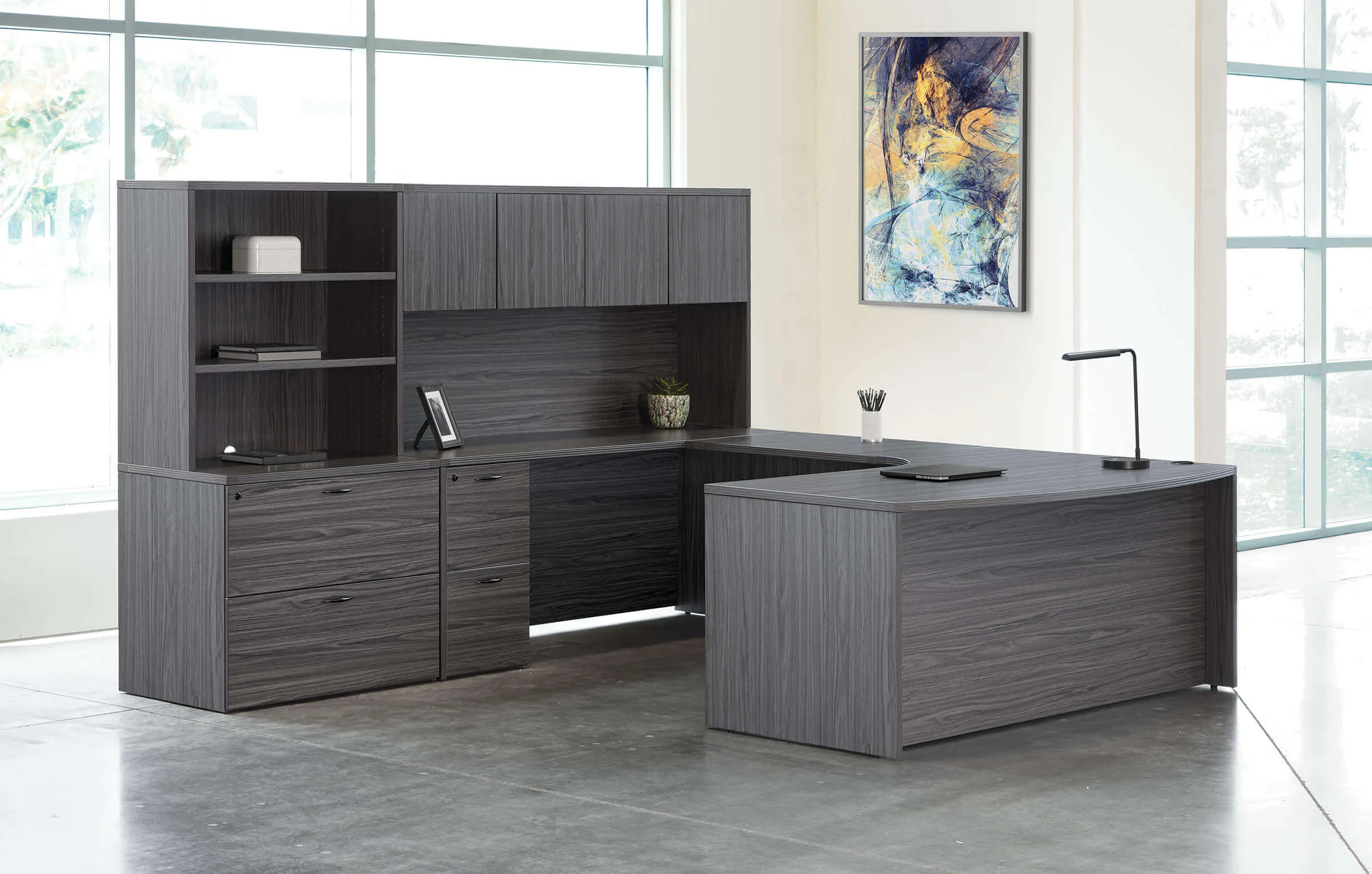The contemporary u shaped desk offers a spacious working and writing area, complete with a hutch and ample storage space in a bookcase. This versatile set allows for various configurations of its pieces and seamlessly integrates into a wide range of spaces and styles. With six finishing options available, it provides the perfect blend of functionality and aesthetics. Whether you need a large workspace to work and display your unique office decor items or ample storage for files and office supplies, this desk set is the ideal choice.