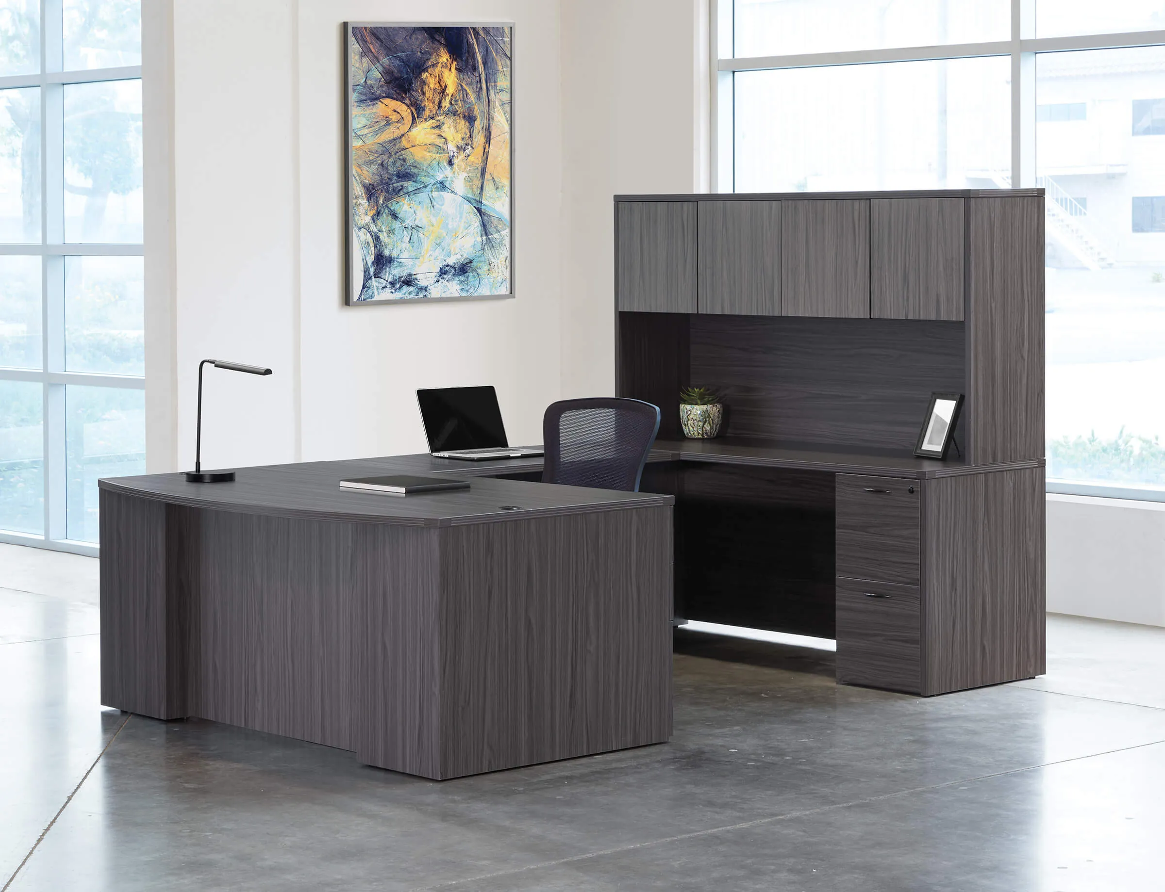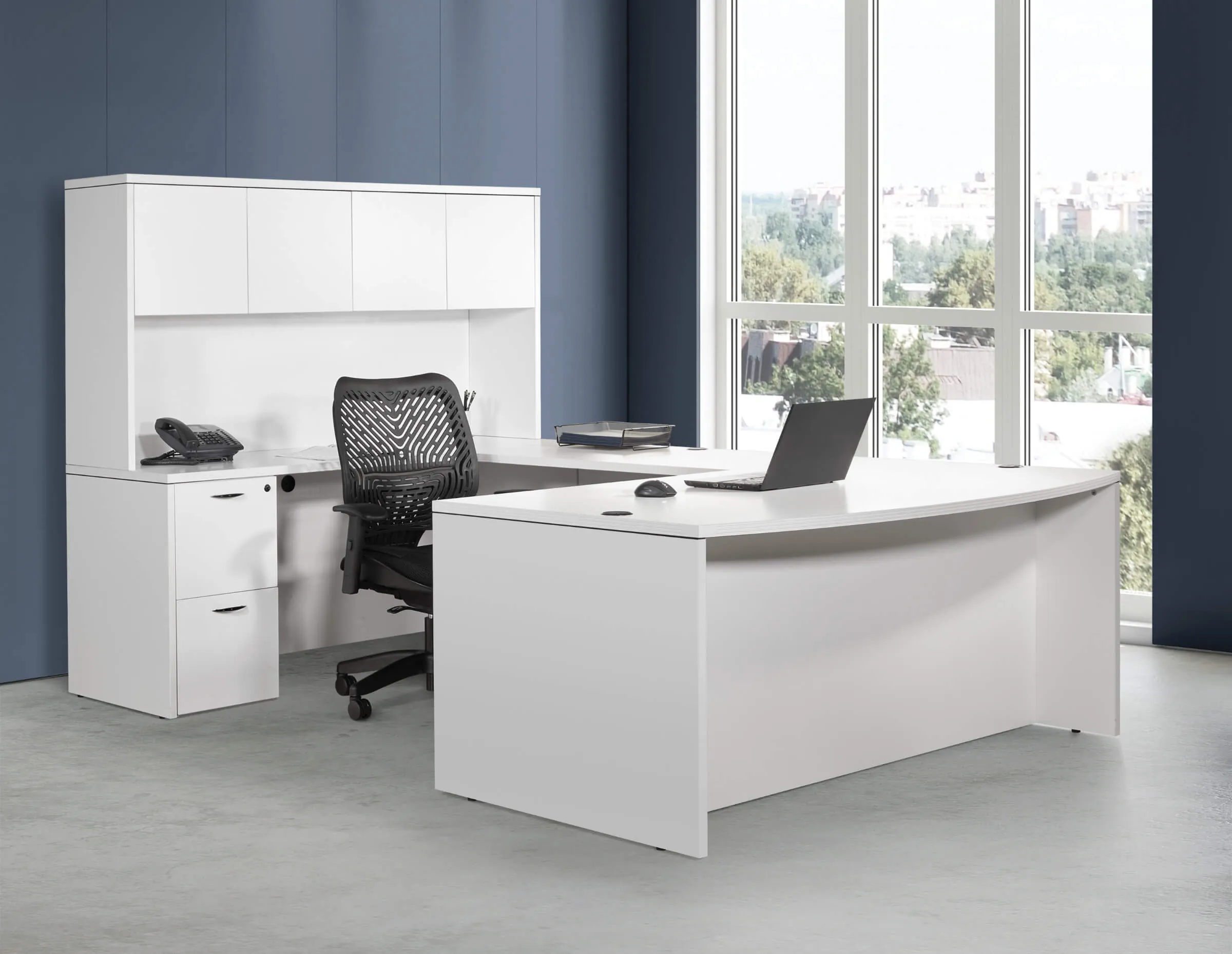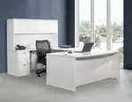 The modern u shaped office desk blending contemporary style with timeless design, making it a versatile addition to any office workspace or personal home office corner. This desk offers a spacious worksurface along with ample storage options including two pedestals and a hutch for organizing books and office essentials. Experience both functionality and elegance with this modern u-shaped desk.