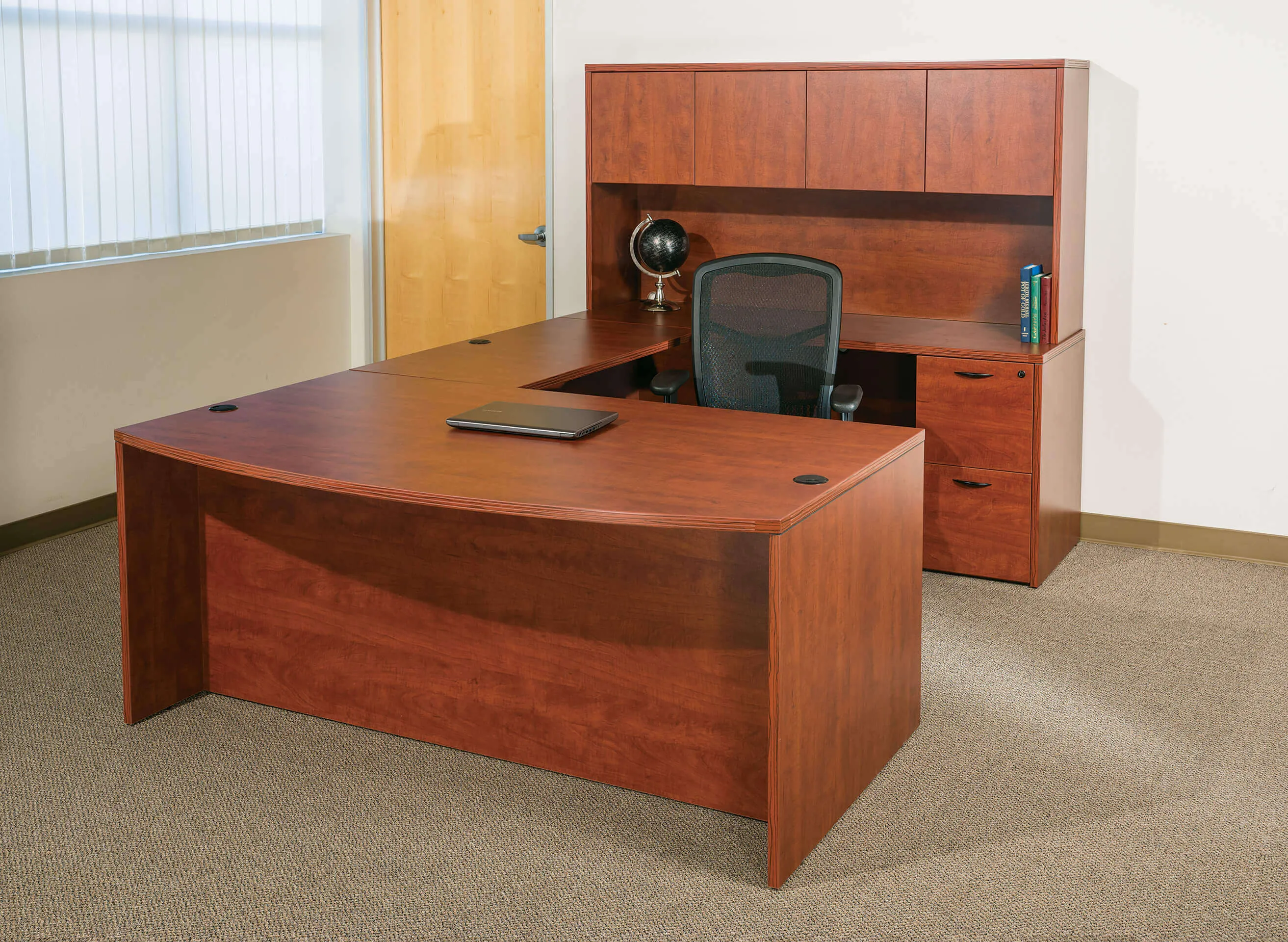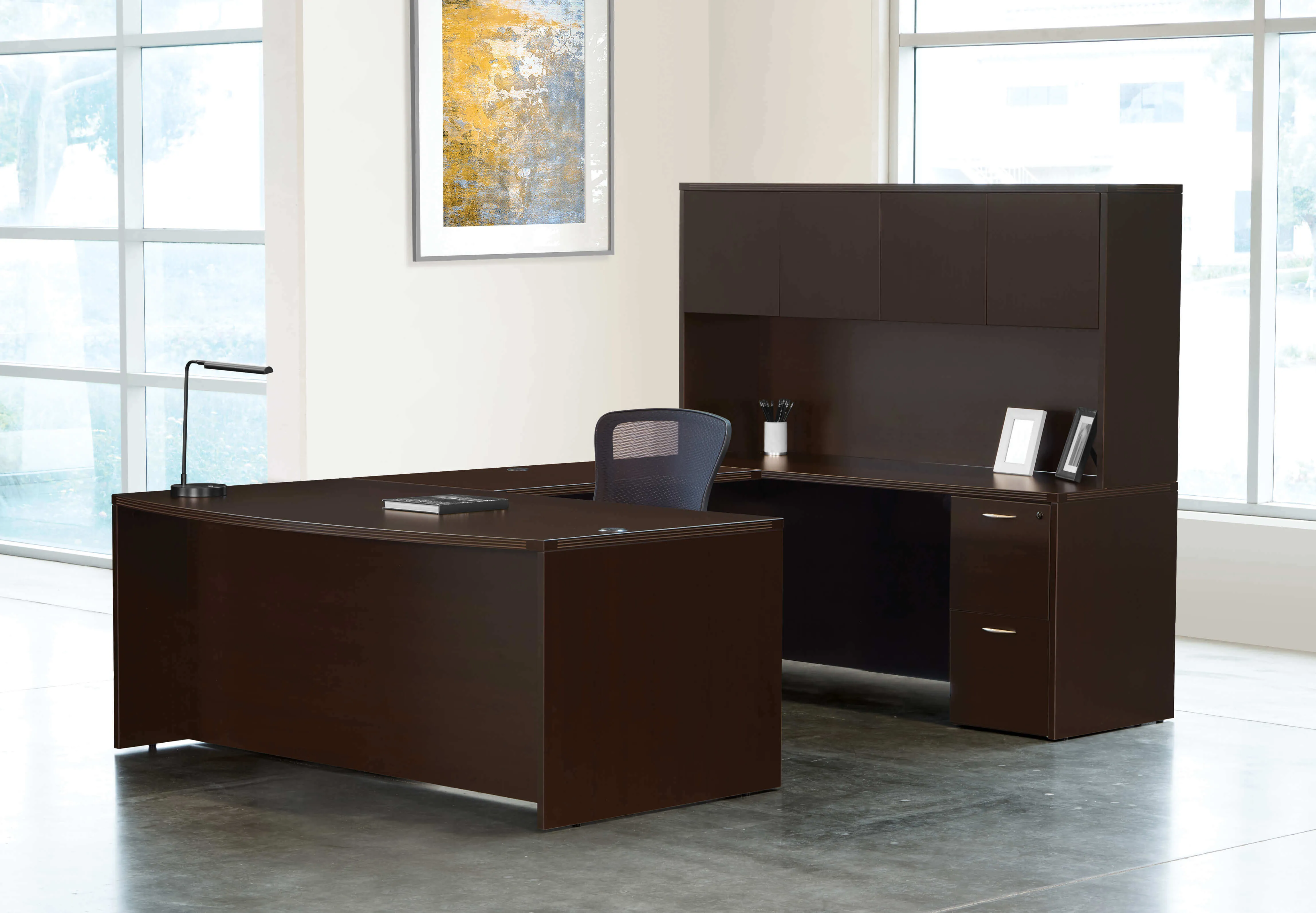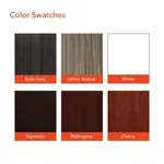 This u shaped desk is available in 6 color options: Espresso tone with metallic hardware pulls; and also in White, Cherry, Mahogany, Slate Grey and Urban Walnut with black hardware pulls.