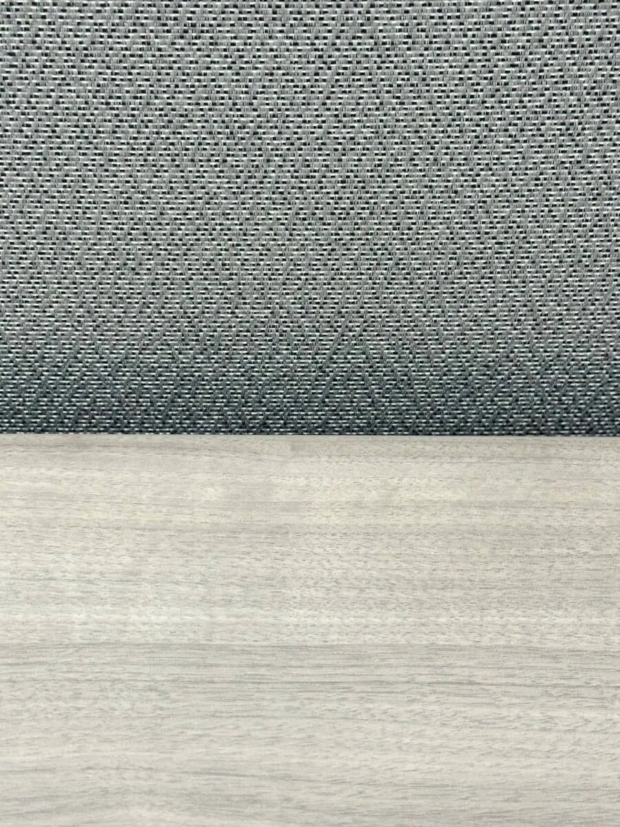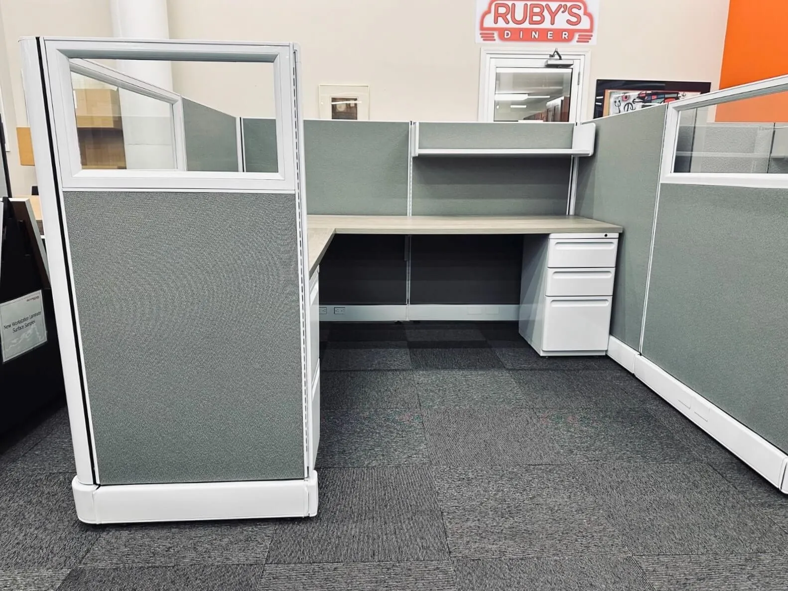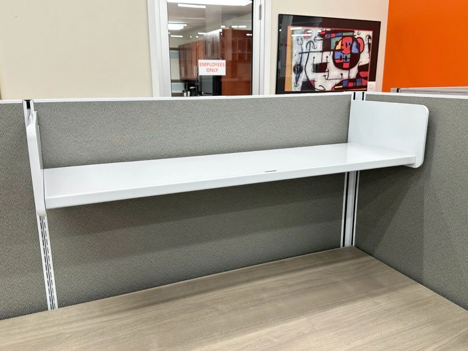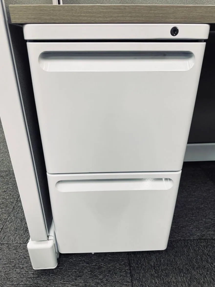 This workstation comes with a worksurface finish: Ceruse Gray Walnut Panel. Trim Color and Paint finish: Appliance White. Panel Fabric in Burch Midway Flint.