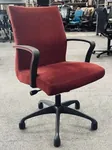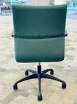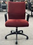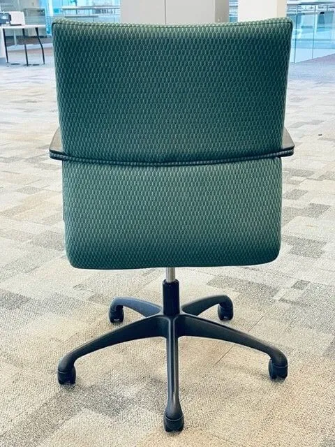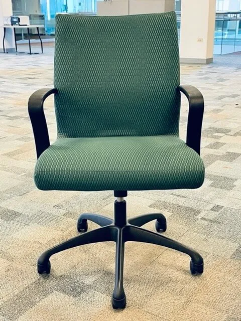 This chair comes black frame and base structure. Red and Green upholstered fabric back and seat. Black caster wheels.