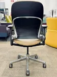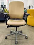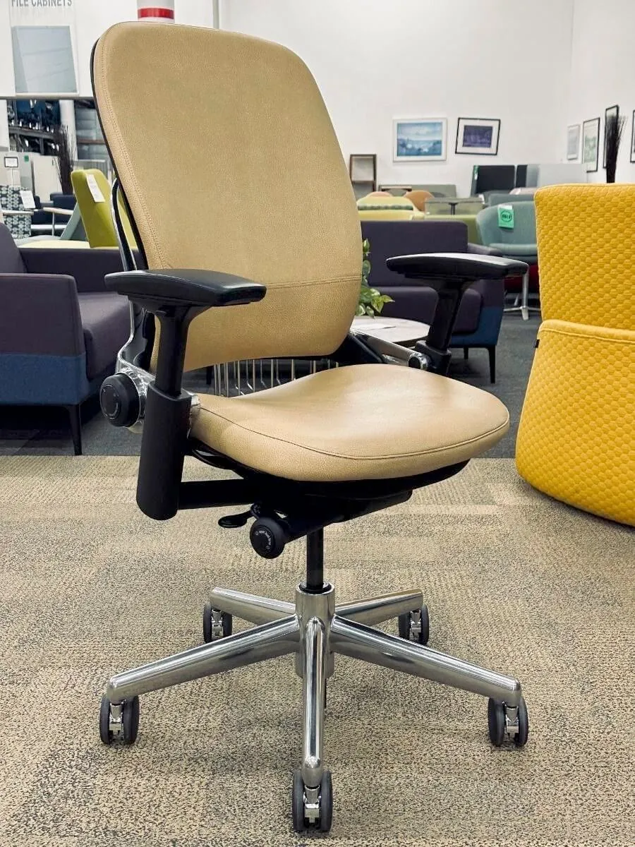 This chair comes black frame. Camel polyurethane back and seat seating. Polished Aluminum base and black caster wheels.
