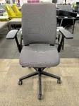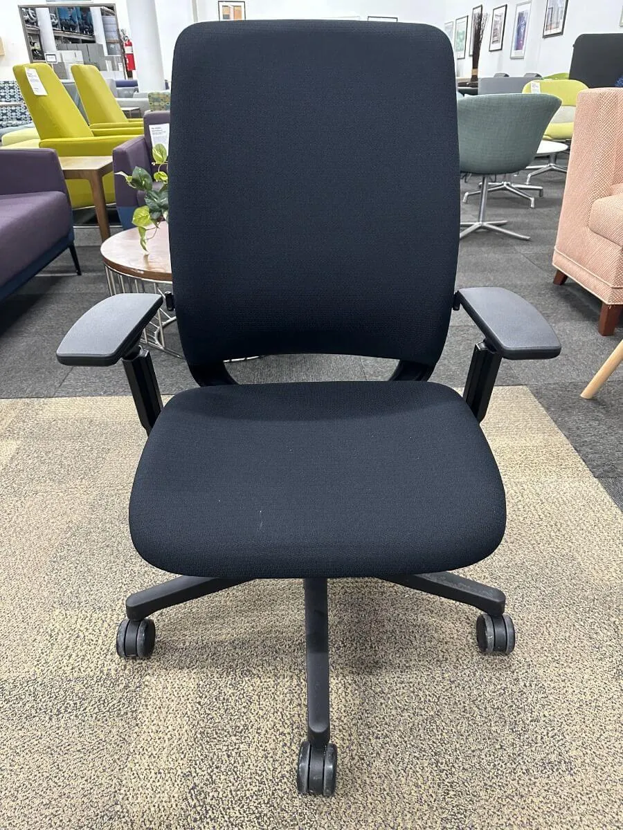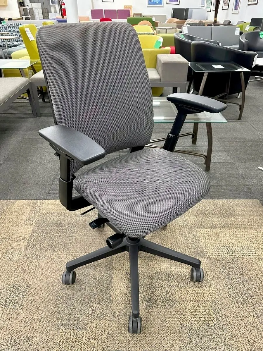 This chair comes with two option one with black upholstered fabric backrest and seat, and the other with a grey upholstered fabric backrest and seat. Black base and structure. Black caster wheels.