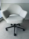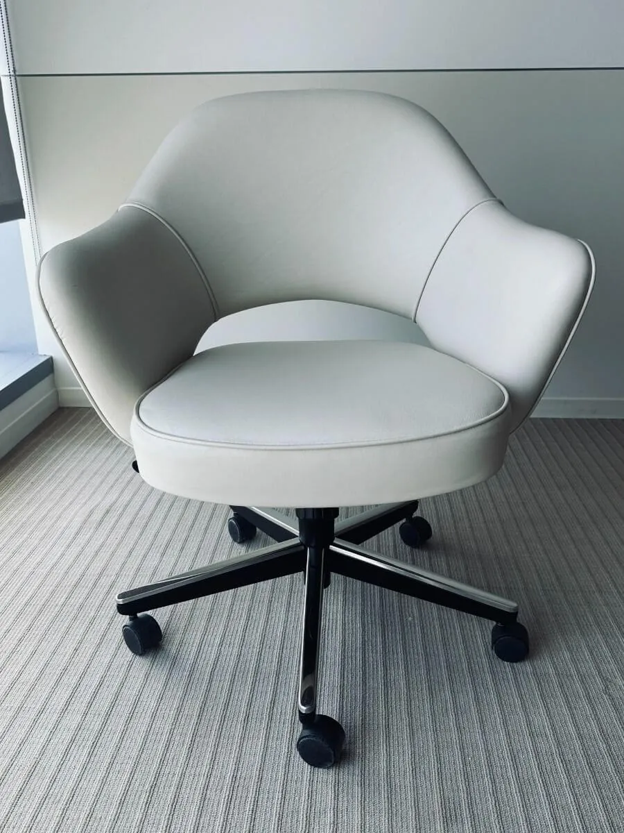 The white leather task chair (30/2.83/100/36) is a chair with a molded form on the backrest extended until the arms, and a foam molded seating. The chair is a has curvature and rounded form that makes it cozy, and the same time special type of chair. The iconical chair design by Eero Saarien is ideal to set into meeting room, conference area and personal office space.