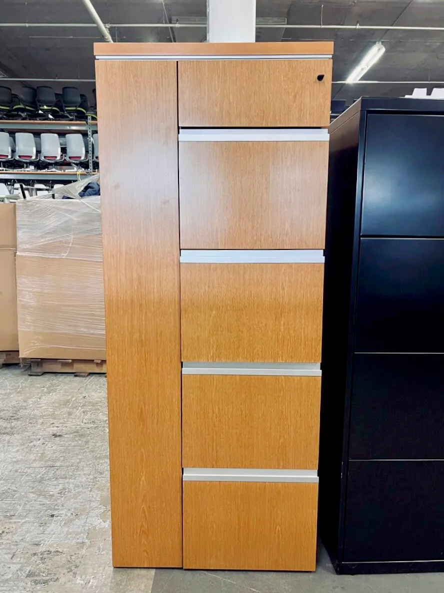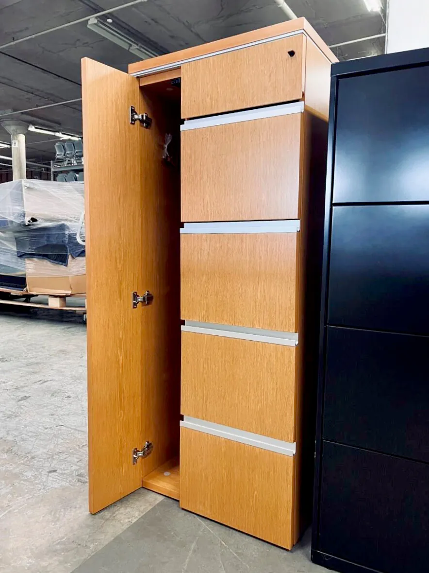 The laminate wardrobe (30/0.24/85/41) is solid and strong piece to store, with a 4 file drawer, one box drawer and a personal wardrobe. This is cabinet with a multiple spacing to storage and with a locking system. This office locker is ideal piece complement and to incorporate into working space that requires an extra place to store.