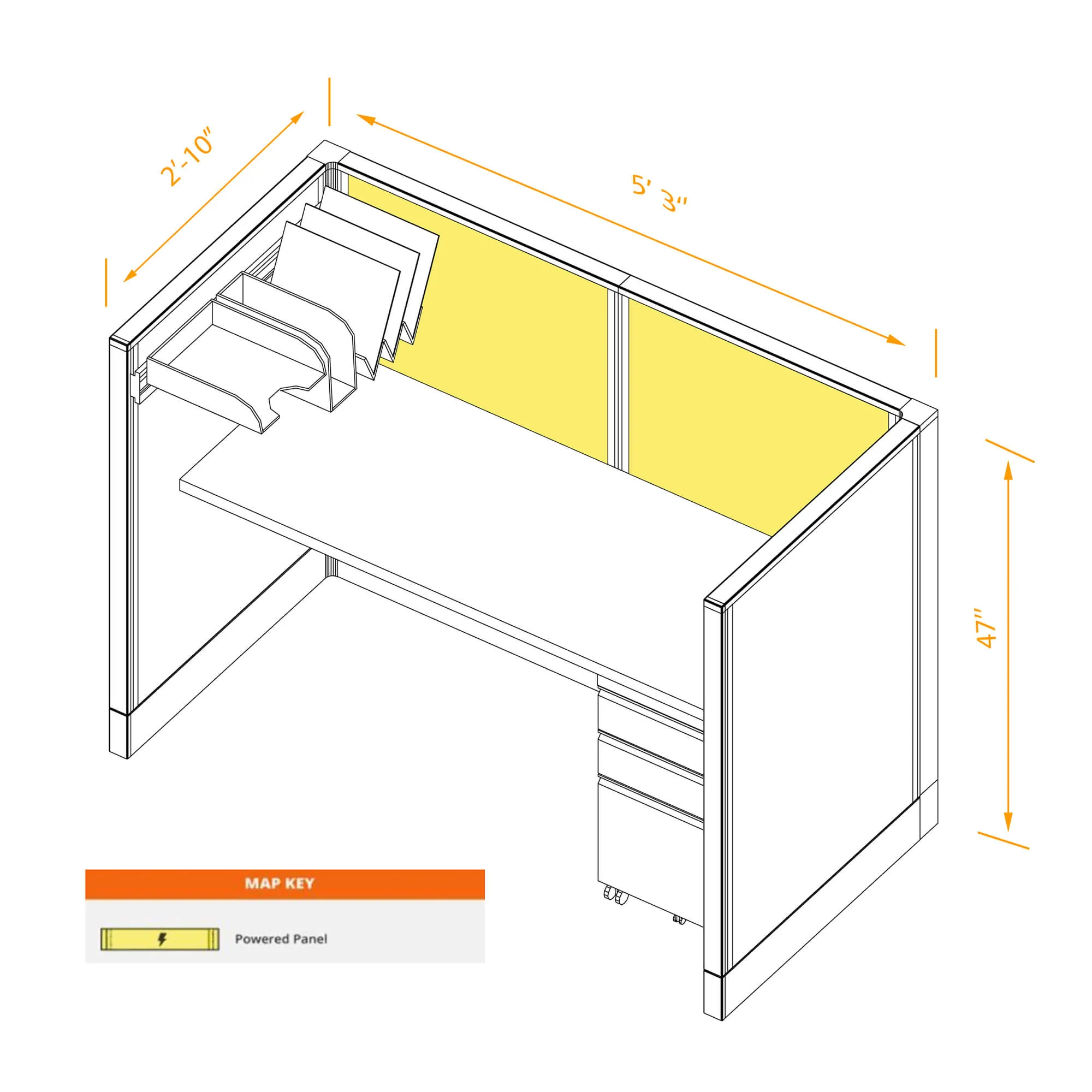 The neutral grey/beige O2™ fabric walls of this work cubicles powered are 2” thick and comprises of a corrugated, honeycombed paperboard interior sandwiched between 1/8” medium density fiberboard, creating lightweight and sound absorbent office panels.