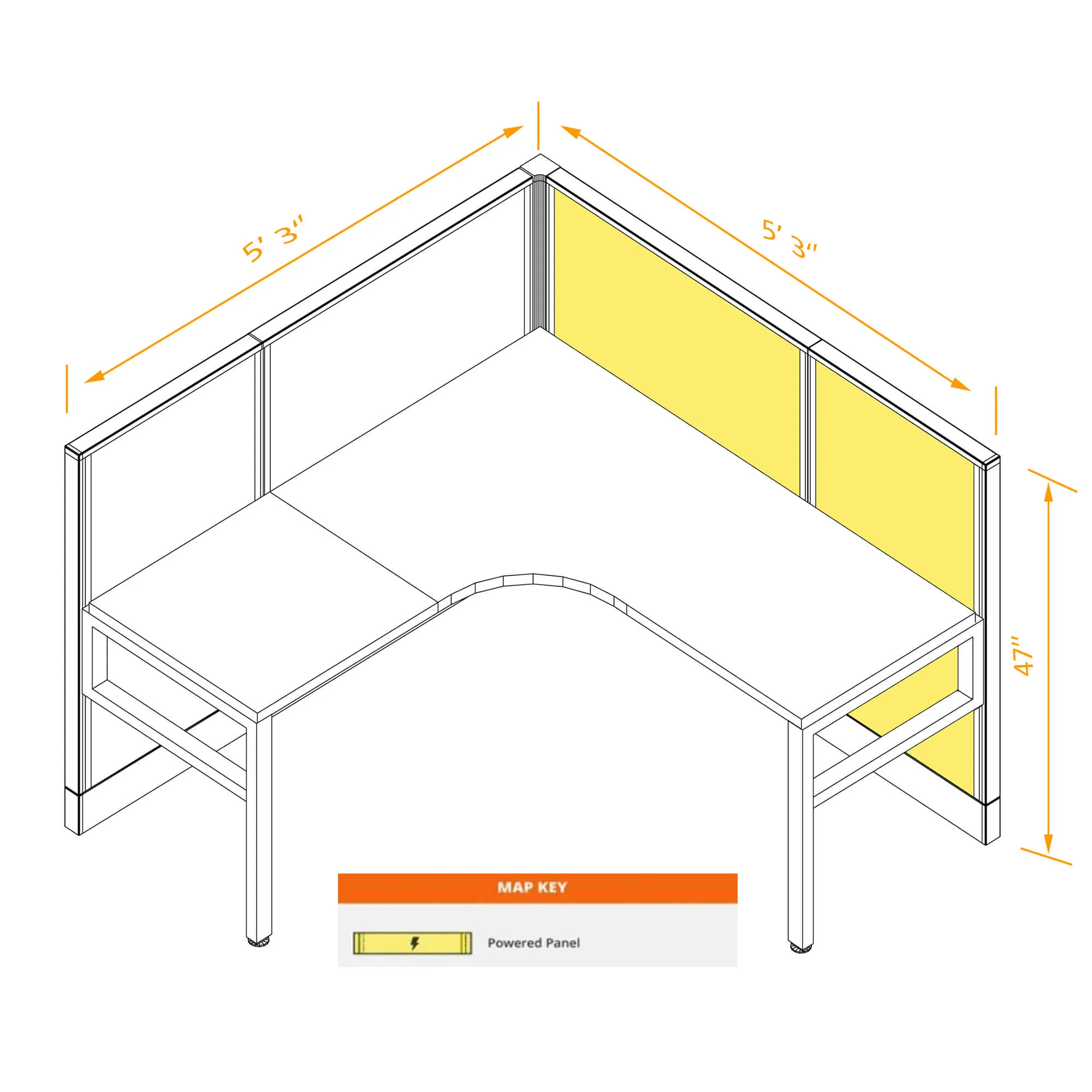 The neutral grey/beige O2™ fabric walls of this work cubicles powered are 2” thick and comprises of a corrugated, honeycombed paperboard interior sandwiched between 1/8” medium density fiberboard, creating lightweight and sound absorbent office panels.